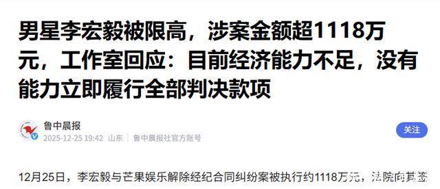 结语 如今27岁的李宏毅就遭到了这件事,免不得想起其他被限制高消费的明星们。 只希望李宏毅可以尽快解决这件事,带着新作品来和大家见面。 信源来源:鲁中晨报2025-12-25男星李宏毅被限高,涉案金额超1118万元,工作室回应:目前经济能力不足,没有能力立即履行全部判决款项