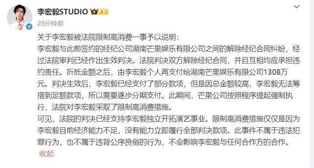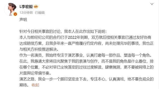 但公司却提起了强制执行的措施,这才有了被限制高消费,被执行1118万元的事情。 就在网友们还在讨论的时候,李宏毅又在社交媒体上发布了一则声明。 他表示自己和前公司的经纪合约已经在2022年的时候到期。